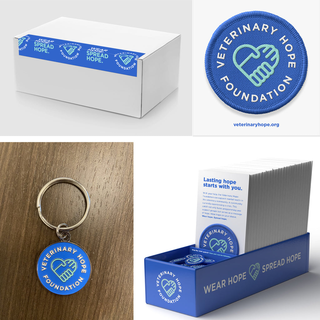 Get outfitted with everything your clinic needs to support the Veterinary Hope Foundation. This starter kit includes [50] stickers, [40] iron-on patches, [50] pet tags, plus a sleek countertop display. It’s an all-in-one package that delivers a message of hope to all.